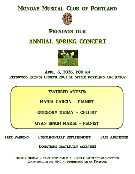 Founded in 1904, Monday Musical Club of Portland supports musical understanding, appreciation and education in the city of Portland.